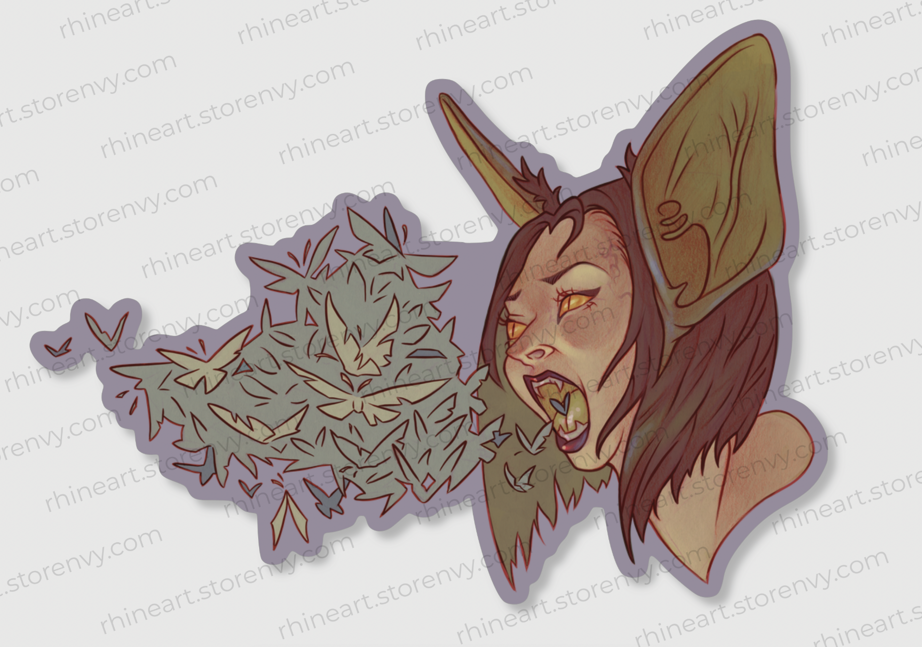 A 2.1"x2.25" weather-resistant vinyl sticker featuring a ferocious Vampire Bat Lady, releasing a hoard of fluttering moths with her terrible screech <3 Sport your love for vampires by putting this sticker on notebooks, water bottles, laptops, and more.